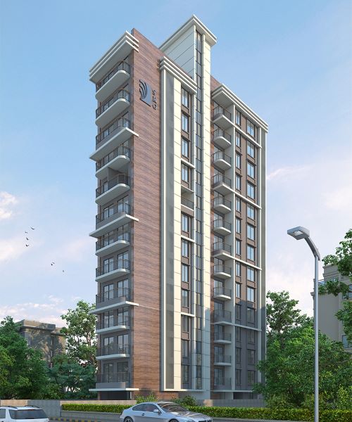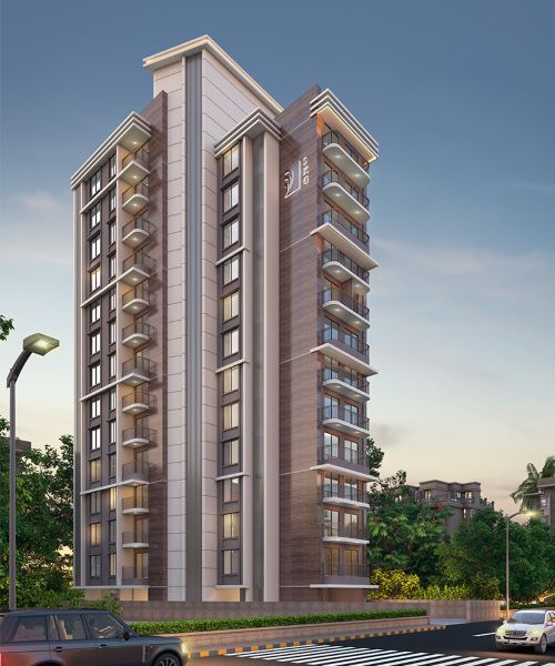 Building comprises of stilt for entrance lobby and services + 13 part storeys housing 1bhk, 2bhk and 3bhk units. All units are planned with balconies. Parking is accommodated in separate tower at rear side of the building and small garden is planned in the front.