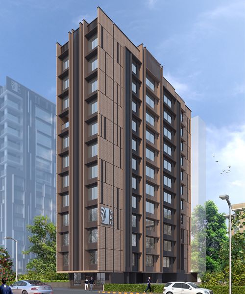Concept : To compose the linear and narrow form of the building, dead surfaces at all four corners are highlighted with a pattern play of dark grey grooves of various sizes on a terracotta coloured textured backdrop, the full height vertical fins frames the openings of the structure balancing the overall composition. The dual tone colour combination of dark grey & terracotta colour and texture gives the structure an earthy look.